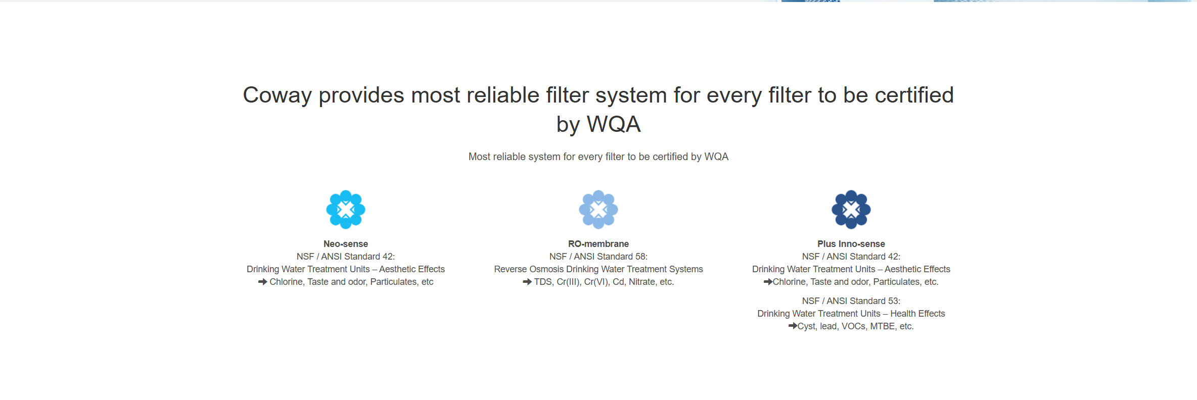 The Coway under sink RO water purifier is certified by the Water Quality Association (WQA) for meeting strict international standards. This certification ensures that every drop of water from your Coway purifier is safe, clean, and trustworthy for daily use.