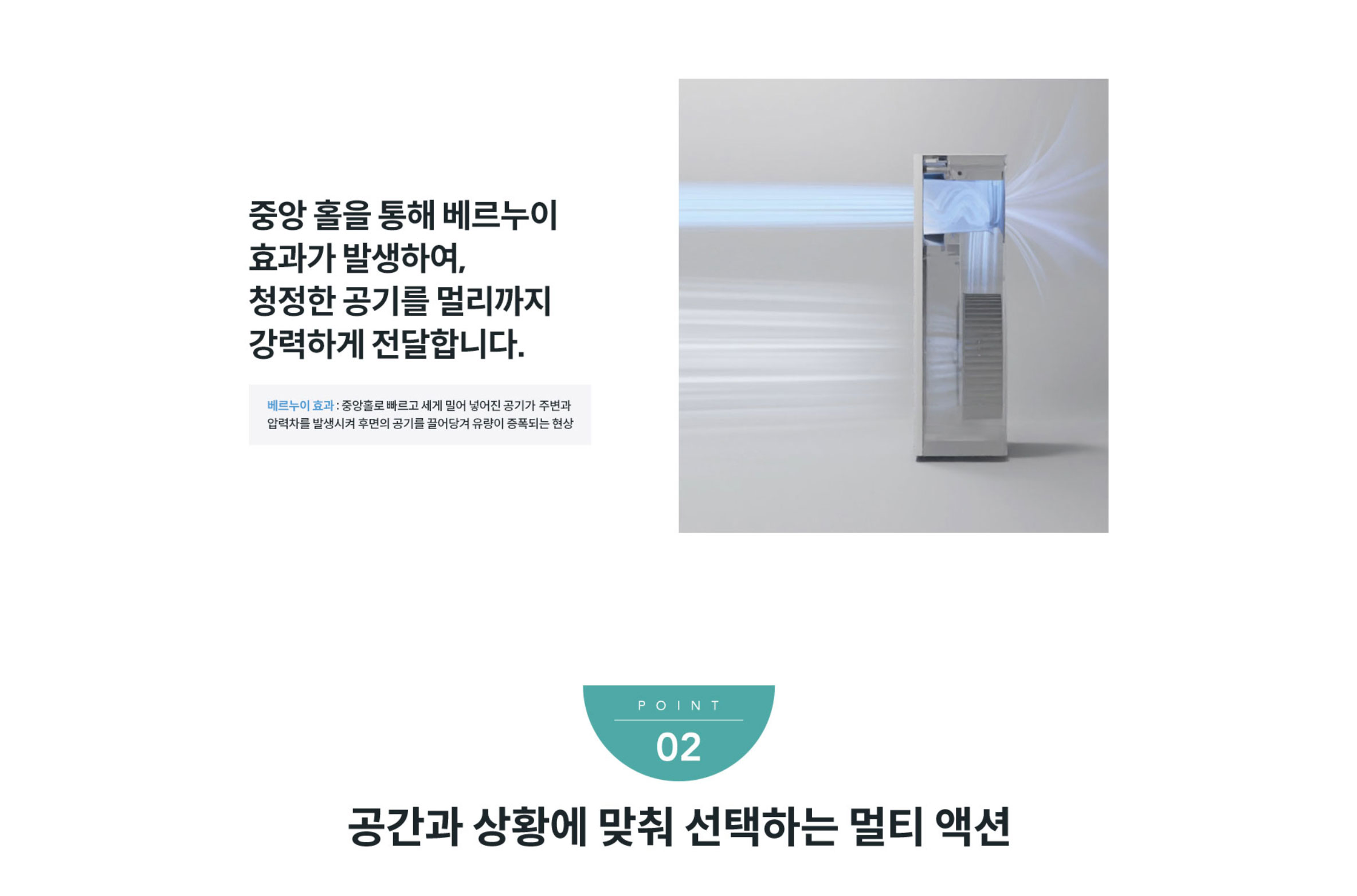 이 기술은 Bernoulli(베르누이) 효과를 응용하여 장거리에서도 공기를 효율적으로 순환시켜, 거실이나 침실 등 넓은 공간에서도 균일한 공기질을 유지할 수 있습니다.