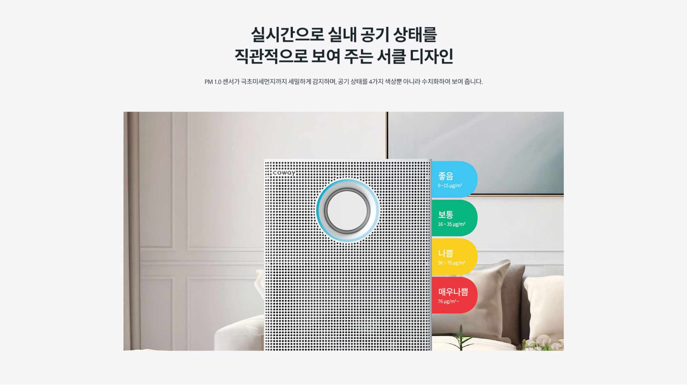 전면부의 PM10·PM2.5·PM1.0 센서가 실내 공기질을 실시간으로 감지하고