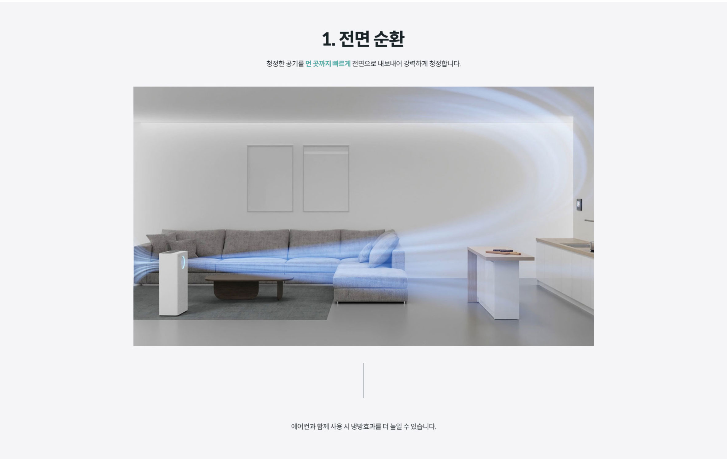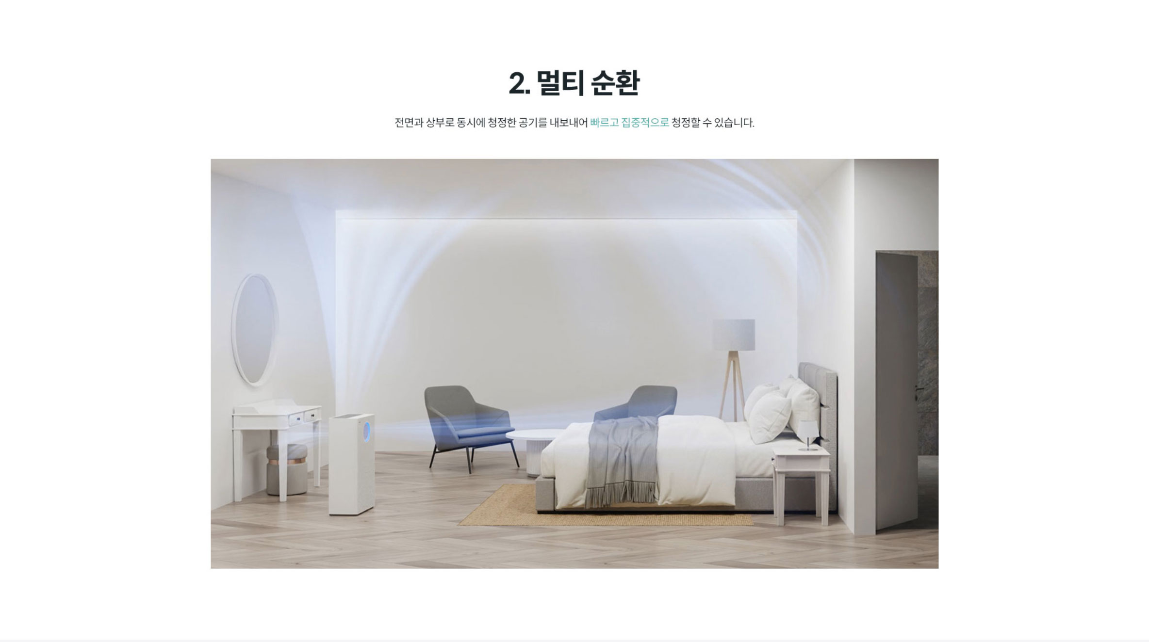 이 기술은 Bernoulli(베르누이) 효과를 응용하여 장거리에서도 공기를 효율적으로 순환시켜, 거실이나 침실 등 넓은 공간에서도 균일한 공기질을 유지할 수 있습니다.