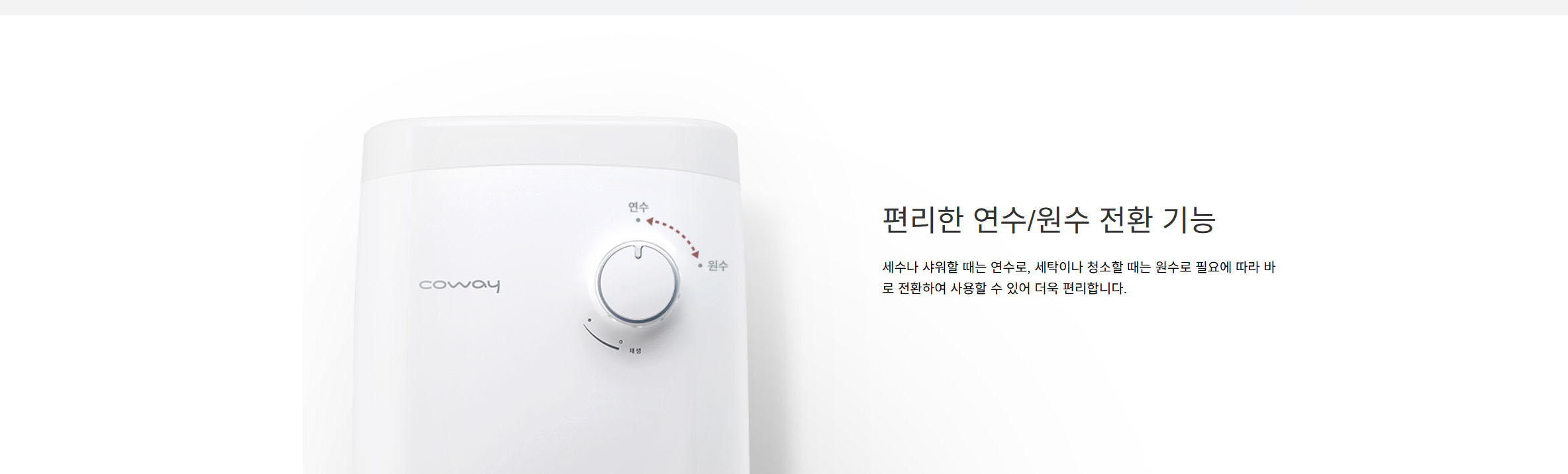 필요에 따라 연수(Soft Water)와 원수(Raw Water)를 간단히 전환할 수 있는 다이얼 또는 밸브 기능을 제공합니다.