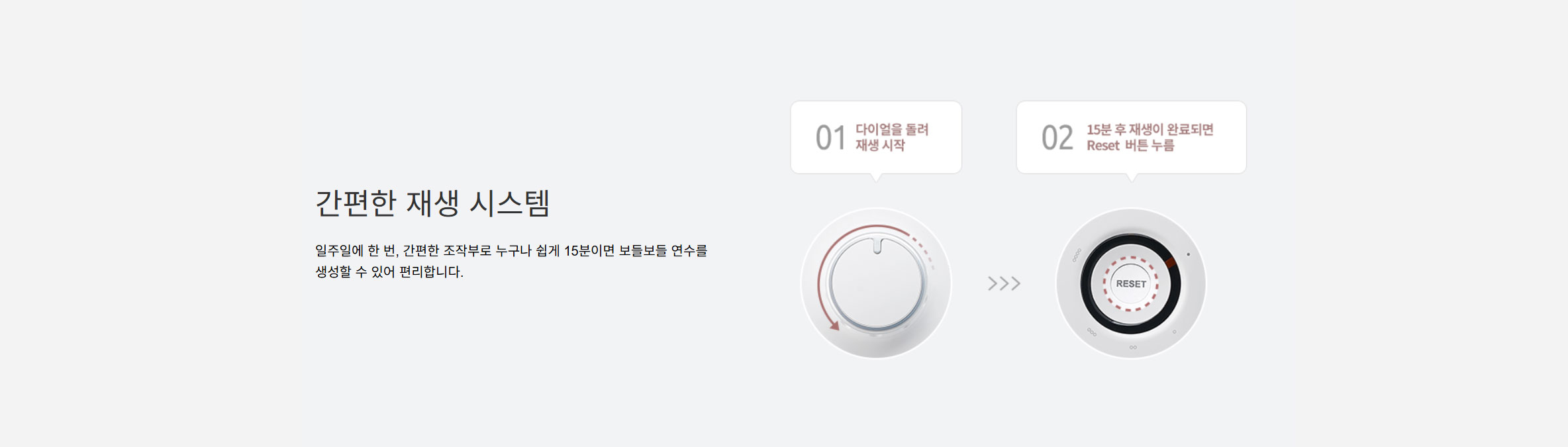 코웨이 소형 슬림 연수기 BB-14BUS는 15분 내외의 간단한 재생을 지원합니다.