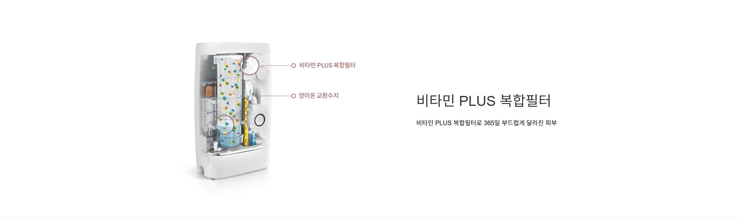 > “비타민 PLUS 복합필터로 물속 잔류염소를 99% 이상 제거하여 부드러운 피부를 만들어 드립니다.”