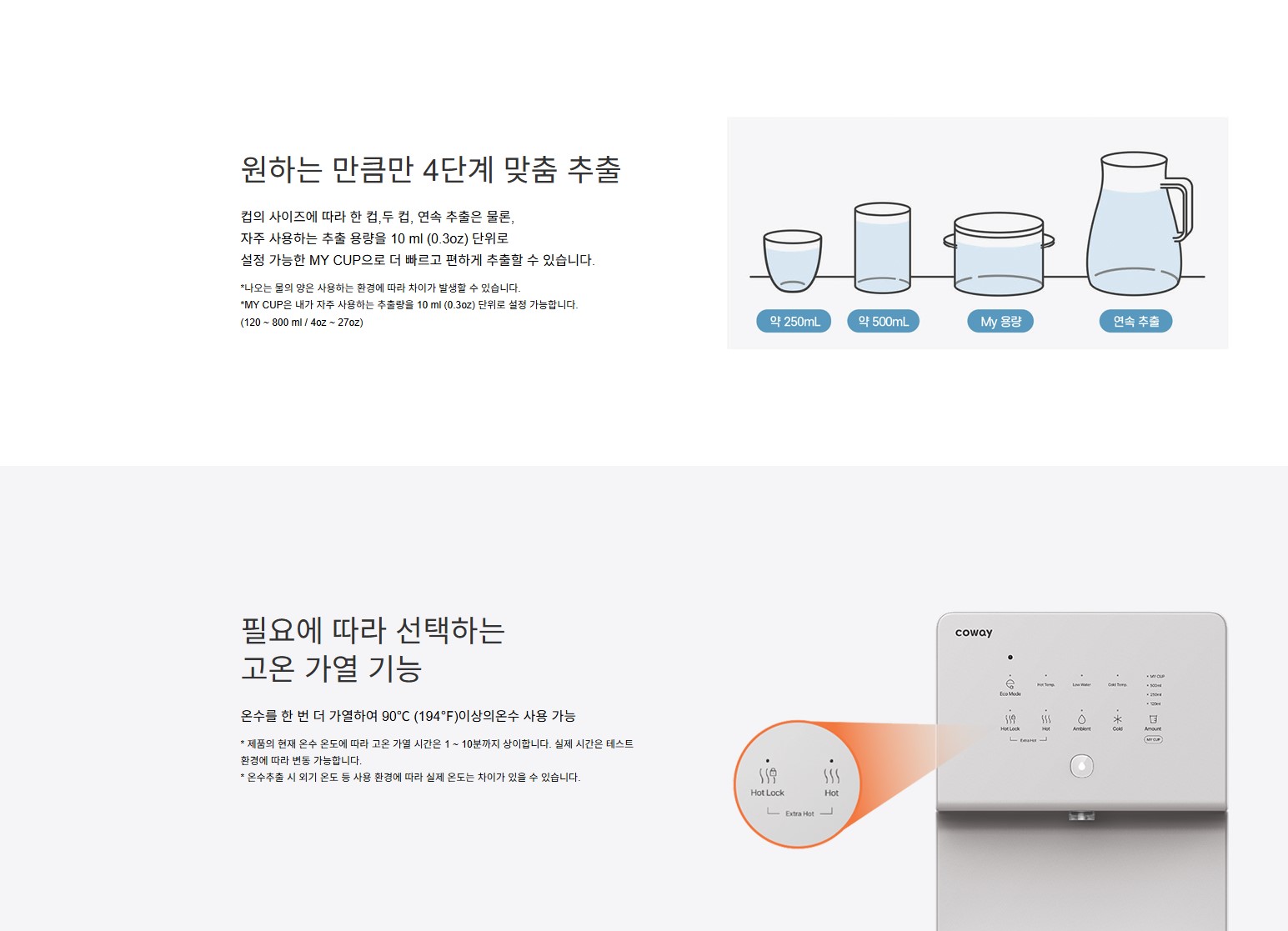 냉수, 온수, 엑스트라 핫(Extra Hot) 세 가지 온도 기능이 탑재되어 원하는 온도의 물을 즉시 사용할 수 있습니다.