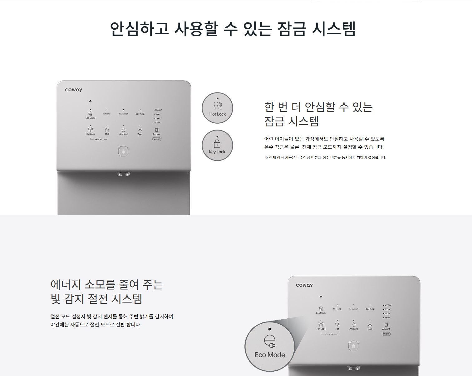 코웨이 카운터탑 냉온 정수기는 절전형 센서 시스템을 적용하여 주변 밝기를 감지하고 자동으로 에너지 사용량을 줄여주는